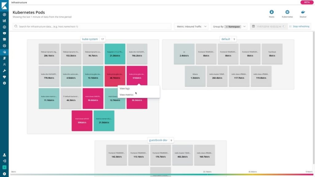 Ein beliebtes Use Case für den Elastic Stack ist das Monitoren der operativen Daten aus der IT-Infrastruktur, indem die verschiedenen Protokolle und Metriken aus dem Datenzentrum erfasst und erkundet werden. Mit Elastic Stack 6.5 wird diese Aufgabe mit Hilfe neuer Apps (Beta-Release) wesentlich vereinfacht. Das Erfassen der Daten mit Filebeats und Metricbeats lässt sich neuerdings zentral von Kibana aus managen, sodass man selbst bei mehreren Tausend Beats-Instanzen den Überblick behält. Die verschiedenen Hosts/VMs/Containers/Pods im Rechenzentrum werden in der neuen Infrastuktur-App in Kibana nach Funktionalität gruppiert dargestellt und nach spezifischen Metriken farblich unterlegt. So kann man kann man schnell auffällige Maschinen identifizieren und zielgerichtet auf die entsprechenden Metriken und Details zugreifen. Mit der ebenfalls neuen Log-App können Logfiles live verfolgt werden und gleichzeitig mit den vielen Möglichkeiten von Elasticsearch analysiert werden.