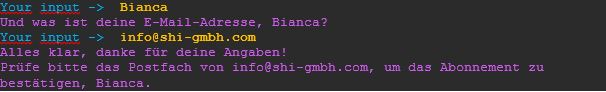 Wir sehen, der Bot reagiert beide Male wie gewünscht. Er erkennt die Absichten des Nutzers, obwohl sie anders formuliert wurden, als die in der nlu.yml angegebenen. Wir geben dem Chatbot nun die gewünschten Infos: Name und E-Mail-Adresse. Daraufhin wird der Python-Code aus der actions.py ausgeführt und der Chatbot antwortet uns, dass wir nun noch das Abonnement bestätigen müssen: