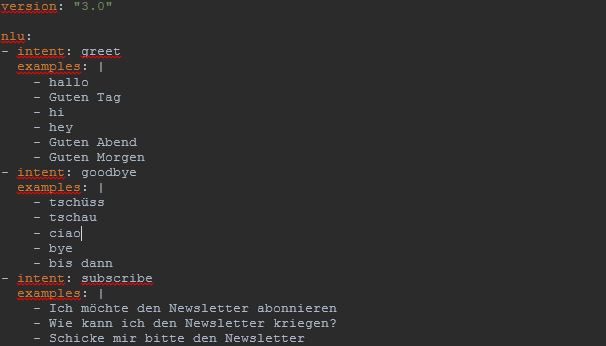 Dies tun wir in der Datei nlu.yml im Verzeichnis data, und zwar gruppiert nach dem „Intent“. Wir beschränken uns hier erstmal auf die grundlegenden Intents für den Use Case – wir nehmen an, dass sich User zum Newsletter anmelden möchten und den Chatbot zudem gegebenenfalls begrüßen und verabschieden. Wir nennen daher Beispiele für einen Intent greet, einen Intent goodbye und einen Intent subscribe.