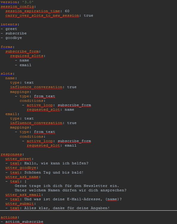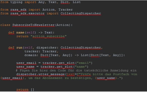 Wichtig im Code ist auch, dass durch return „action_subscribe“ festgelegt wird, unter welchem Namen diese Aktion aufgerufen werden kann. Diesen Namen haben wir bereits in der domain.yml im Abschnitt actions gelistet, sodass der Bot die Aktion kennt.