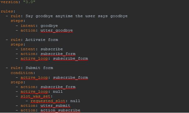 Im mittleren Codeblock haben wir eine Regel hinzugefügt, die das subscribe_form auslöst, wenn der Benutzer die Absicht subscribe äußert.