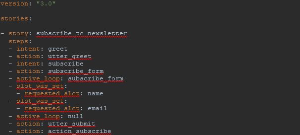 In dieser Story tauschen der Benutzer und der Assistent Grüße aus, der Benutzer äußert den Wunsch, den Newsletter zu abonnieren, und der Assistent beginnt, die benötigten Informationen über das Formular namens subscribe_form zu sammeln. Dann bedankt er sich für die Eingabe und führt die Anmeldung aus.