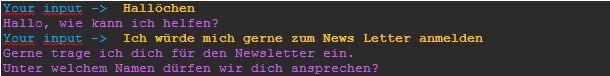 Dieser Befehl startet den Rasa Server – sofern nicht anders konfiguriert – auf Port 5005 und lädt unser neustes NLU-Modell. Wir können nun über das Terminal die Unterhaltung starten, z.B. mit einer Begrüßung und der anschließenden Frage nach dem Newsletter: