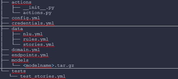 Es wird dann ein initiales Rasa-Projekt unter dem angegebenen Pfad erstellt. Die entstandene Verzeichnisstruktur ist die folgende (wobei der Ordner models tatsächlich erst nach dem Trainieren eines ersten Modells erzeugt wird):