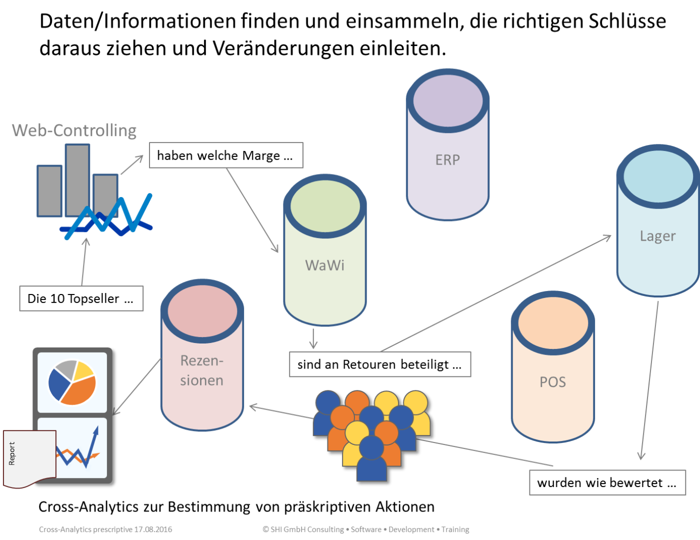 Cross-Analytics beschreibt eine Vorgehensweise, mit der fundierte Entscheidungen, die sich auf Daten stützen, im Unternehmen ermöglicht werden. Dadurch wird das Versprechen von Advanced Analytics eingelöst, wichtige Zusammenhänge in den bestehenden Geschäftsprozessen zu erkennen, vorauszusagen und zu optimieren, und somit das eigene Geschäft nachhaltig zu verbessern.