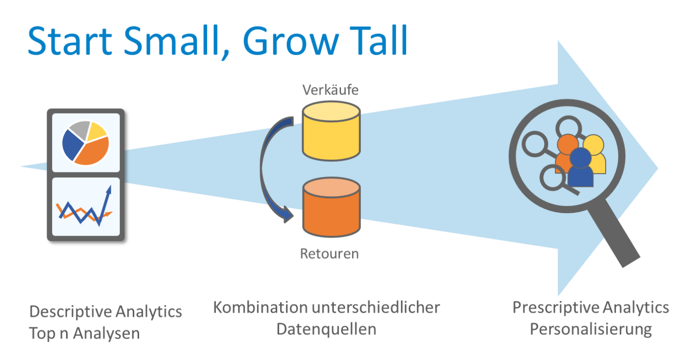 Strategisch hat sich bewährt, sich zunächst auf eine bestimmte, geschäftsrelevante Fragestellung zu konzentrieren, die etwa im Rahmen eines Proof-Of-Concept-Projekts schnell validieren lässt. Man möchte am Anfang den Aufwand begrenzen, der nötig ist um einen Nutzen zu generieren. Bevor es an die Zusammenführung relevanter Daten geht, ist es sinnvoll die ursprüngliche Idee weiter zu präzisieren, indem man den nach dem konkreten Business fragt, nach Metriken, die Erreichung eines Ziels feststellen lassen, nach Datenquellen, die die Metriken abbilden, usw.