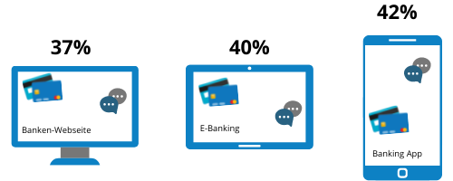 Eine höhere Akzeptanz als bankfremde haben bankeigene Kanäle wie Chats auf der Webseite der Bank, in der Banking-App und im E-Banking. Von den deutschen Umfrageteilnehmern stimmten 37% zu, dass sie den Chat auf der Webseite zur Kommunikation nutzen würden. Beim Chat im E-Banking stimmten 40% zu, und beim Chat in der Banking-App 42%.