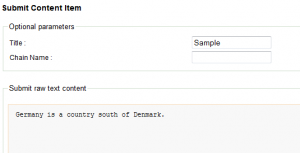 Nun können Sie unter Submit Content Item einen Datensatz anlegen. Ein Datensatz wird in der Apache Stanbol Terminologie auch Content Item genannt. Vergeben Sie einfach einen Titel und schreiben einen kurzen Beispieltext. Dieser sollte nach Möglichkeit auch über eine oder mehrere Entitäten verfügen, damit die volle Stärke von Apache Stanbol zur Geltung kommt. Als einfaches Beispiel wähle ich den Titel Sample und einen einfachen Inhalt: Germany is a country south of Denmark. Vergleichen Sie hierzu Abbildung 2.