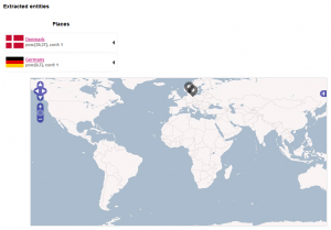 Nachdem Sie den Text mit Submit Text abgeschickt haben, erscheint nach kurzer Wartezeit bereits eine Weltkarte, auf der die beiden Länder Dänemark und Deutschland markiert sind. Ebenso sind die beiden gefundenen Entitäten separat aufgeführt. Nun befindet sich bereits ein Datensatz im Contenthub bzw. im Solr Index. Vergleichen Sie hierzu Abbildung 3.