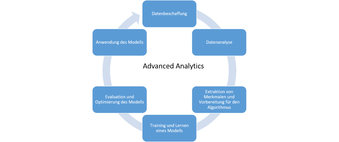 Die Anwendung von Advanced Analytics soll je nach Cross Analytics Strategie dazu dienen, in einem ersten Experiment mit überschaubarem Aufwand zu überprüfen, ob ein konkretes Business-Ziel realisiert werden kann. Das kann bspw. die Personalisierung von Kaufempfehlungen für mehr Umsatz sein oder Vorhersagen und Vermeiden von Retouren. Will man einen solchen Proof of Concept tatsächlich umsetzen, durchläuft man in dem Projekt verschiedene Phasen, die typisch für die Anwendung von Advanced Analytics sind. Als Erstes müssen die Daten beschaffen werden, die die relevanten Zusammenhänge beschreiben können (sh. Abbildung 1).