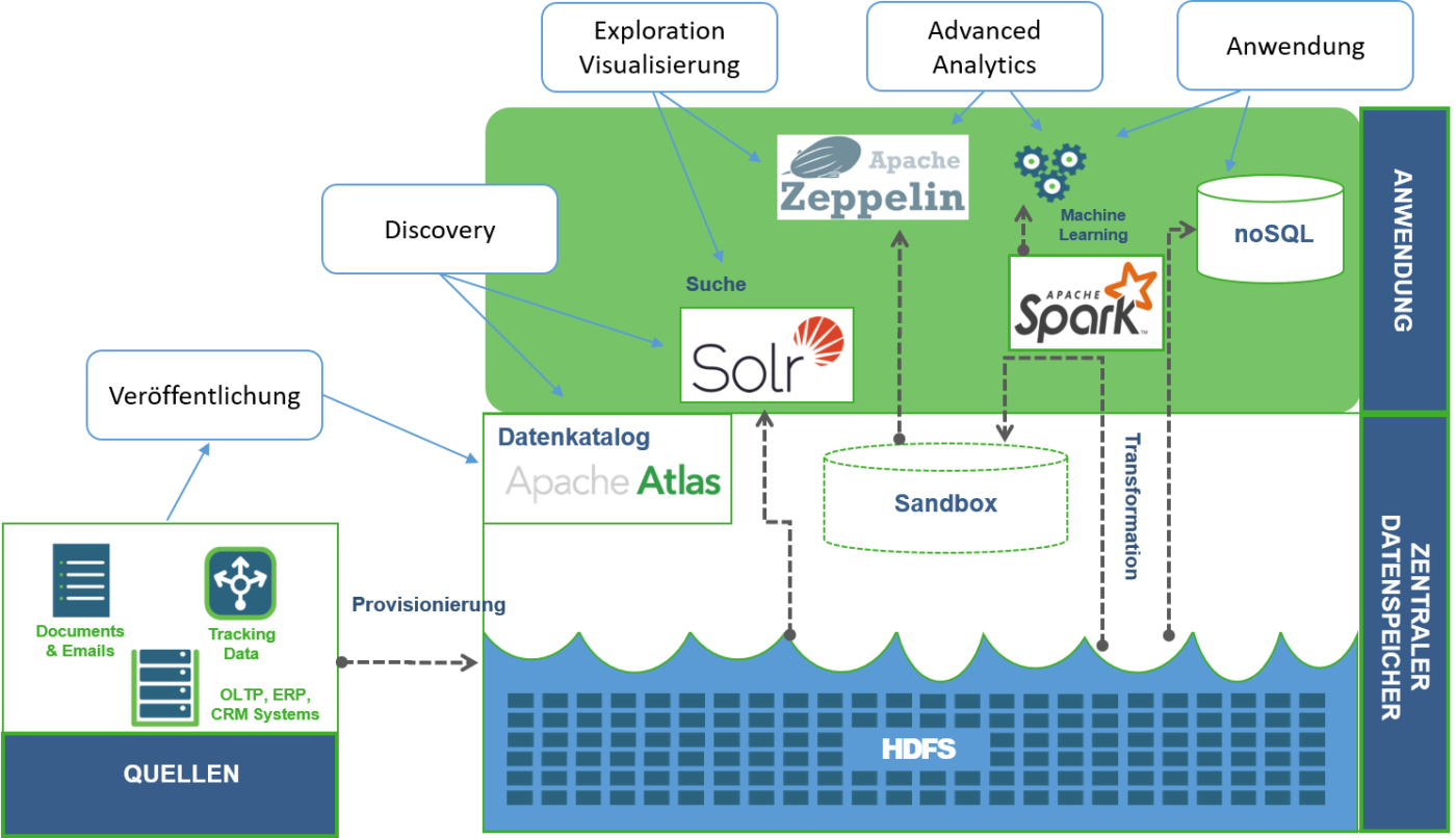 Hierzu gehört sicherlich ein Datenkatalog, in dem man zunächst die verschiedenen Daten veröffentlicht und mit Hilfe von Metadaten beschreibt und klassifiziert. Eine entsprechende Suchfunktion innerhalb des Datenkatalogs erleichtert dann die Aufgabe, die relevanten Daten für ein Projekt zu finden und zu interpretieren (s. Abbildung 1). Ein Beispiel einer solchen Komponente ist Apache Atlas, das die Funktionalität eines Datenkatalogs für das HDFS zu Verfügung stellt. Ein Datenkatalog spielt auch eine wichtige Rolle, wenn es darum geht, für die Sicherheit der Daten und die Einhaltung von Datenschutzvorgaben zu sorgen, da man darin Richtlinien für den Zugriff und die Länge der Speicherung definieren kann.