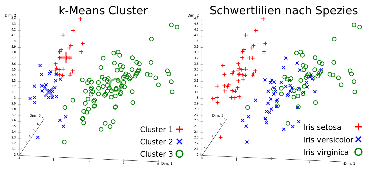 Ein Klassiker unter den Clusterverfahren ist der K-Means-Algorithmus, von dem es wiederum verschiedene Abwandlungen gibt. Der Name kommt zum einen daher, dass die Anzahl der Ergebnis-Cluster mit dem Parameter K vorgegeben werden muss. Zum anderen versucht der Algorithmus, zu jedem Cluster einen Schwerpunkt zu finden, sodass der mittlere Abstand („Means“) der Datenobjekte im Cluster zum Schwerpunkt minimal ist. Die zu gruppierenden Objekte werden in einem mehrdimensionalen Raum dargestellt; K-Means ordnet dann effektiv jedes Objekt dem nächstgelegenen (nach Euklidischer Distanz) Clusterschwerpunkt zu. Ein Beispiel ist in Abbildung 2 dargestellt.