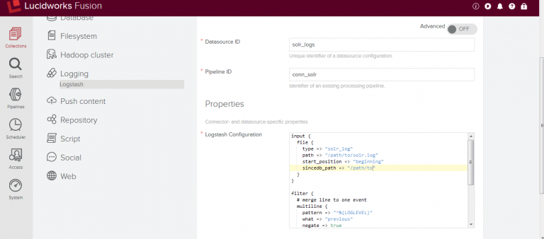 Der obige Screenshot zeigt den neuen Connector in Fusion. Wie immer ist die Konfiguration simple. Der „output“ muss nicht mit der Logstash Konfiguration beschrieben werden, da der Connector die Daten automatisch in die Lucidworks Indexing Pipeline indexiert.