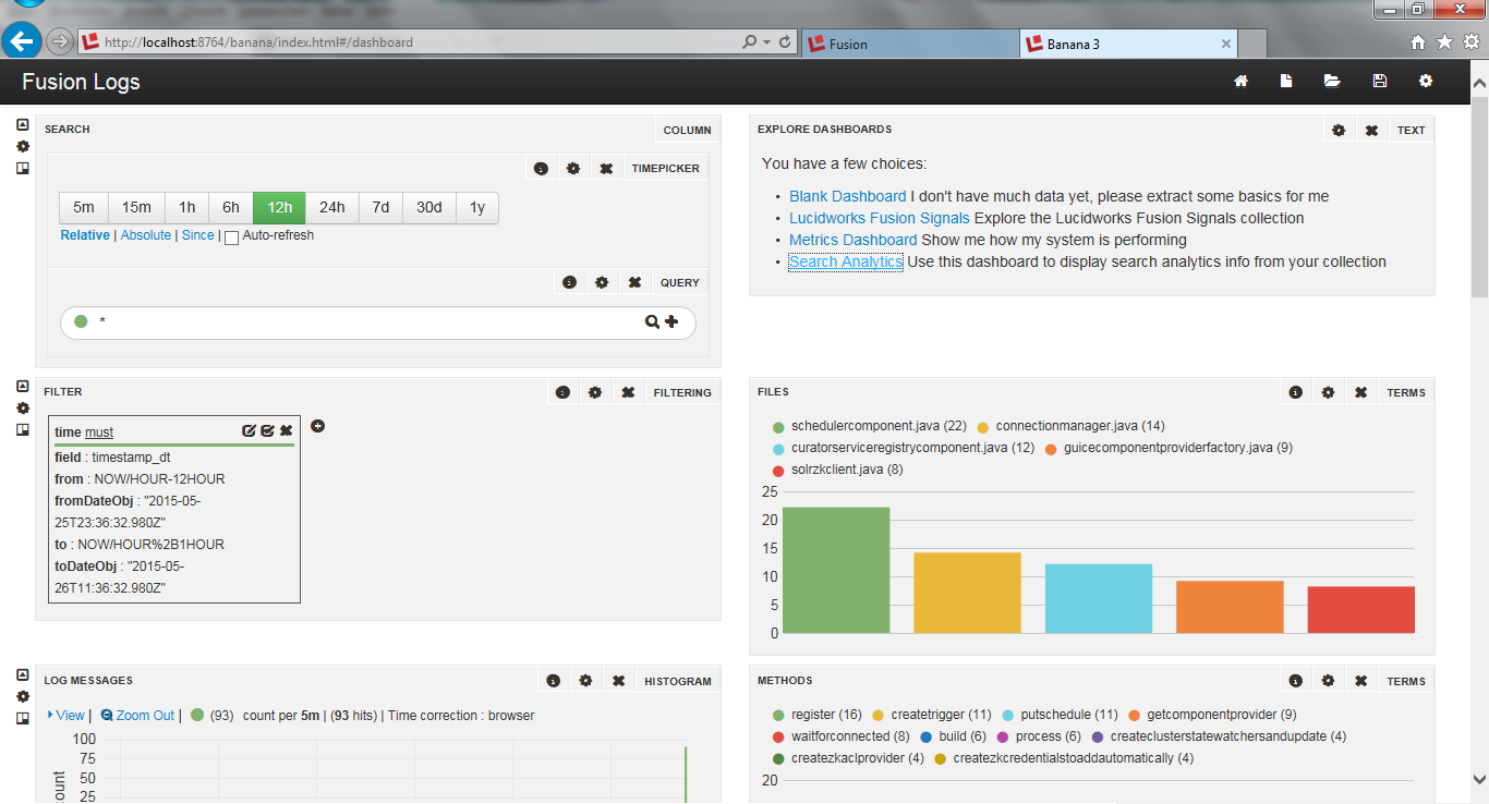 Aber Halt!!! „Log“ Visualisierung gab es in den vergangenen Versionen von Fusion auch schon bereits. Das Framework SiLK (Solr integrated Logstash & Kibana) war bereits seit der ersten Version direkt von der Startseite aufrufbar. Hierbei handelt es sich primär um die Visualisierungskomponente Banana, die in einem separaten Fenster geöffnet wird. Mit dieser integrierten Komponente konnten und können auch weiterhin beispielsweise die Daten der Collections bzw. die Log Events innerhalb der Collections mittels Charts, Histogragrammen etc. Visualisiert werden. Die nachfolgenden Screenshots zeigt die bisherige Integration von SiLK.