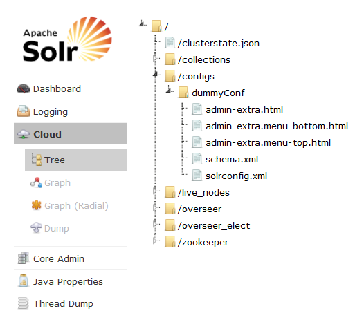 Im nachfolgenden Screenshot wird eine Solr Konfiguration (dummyConf) vom ZooKeeper verwaltet und ist mit 3 Collections (_dummy, collectionOne, collectionTwo) verlinkt.