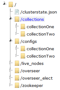 Im nachfolgenden Screenshot wird eine Solr Konfiguration (dummyConf) vom ZooKeeper verwaltet und ist mit 3 Collections (_dummy, collectionOne, collectionTwo) verlinkt.