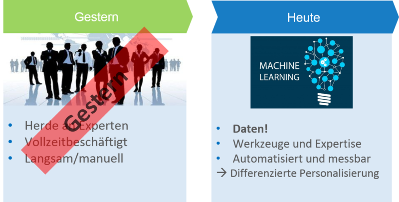 Was früher nur durch Experten möglich war, die manuell Daten ausgewertet und mit großen Mühen personalisiert haben, funktioniert heute ganz einfach und automatisiert mit Machine Learning. Die Daten haben Sie in der Regel schon, aber vielleicht nutzen Sie noch nicht das volle Potenzial. Denken Sie jetzt um!