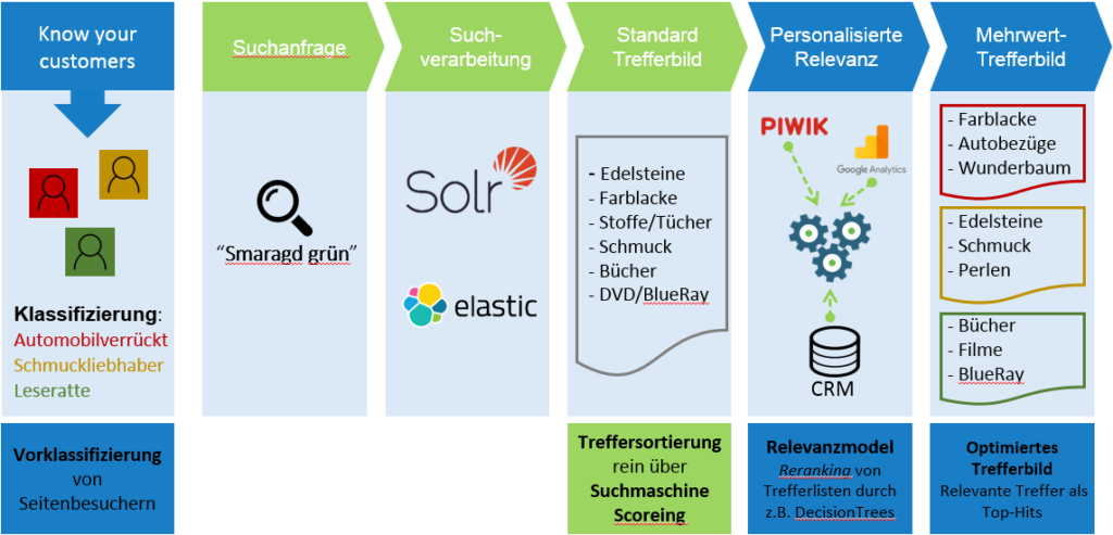 Wir bezeichnen Personalisierung als die Anpassung von Informationen an die Vorlieben und Bedürfnisse eines Benutzers oder einer Benutzergruppe. Diese Anpassung erfolgt auf Basis von fein gegliederten Profilen, denen ein Benutzer oder eine Benutzergruppe zugeordnet werden kann. Die Suchergebnisse für einen User werden durch diese Profile relevanter gestaltet. Durch dieses kollaborative Filtern erreichen Sie mehr Relevanz in Ihrem Shop.