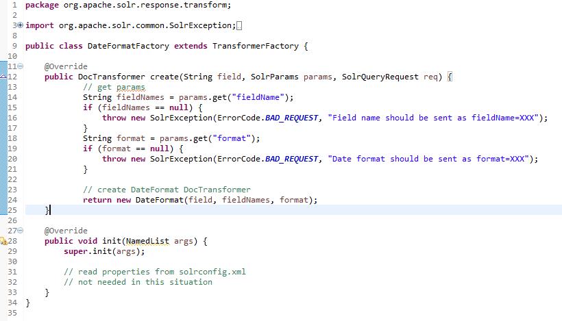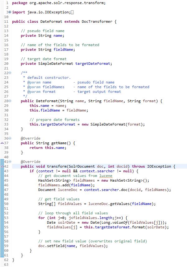 Um einen eigenen DocTransformer zu entwickeln muss man lediglich zwei Klassen implementieren. Wie bei fast jeder Solr Komponente gibt es eine Klasse für den funktionalen Code und eine Factory zum Konfigurieren der ersten Klasse. Das folgende Beispiel formatiert ein Feld vom Typ „date“ in ein gewünschtes Ausgabeformat. Hierfür wird die „dynamische“ Konfiguration verwendet.