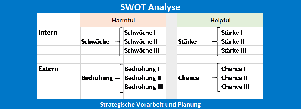 Eine gute und einfache Möglichkeit, sich seiner Stärken und Schwächen generell oder projektbezogen bewusst zu werden ist der Einsatz der Strength Weakness Opportunity Threat Analyse.
