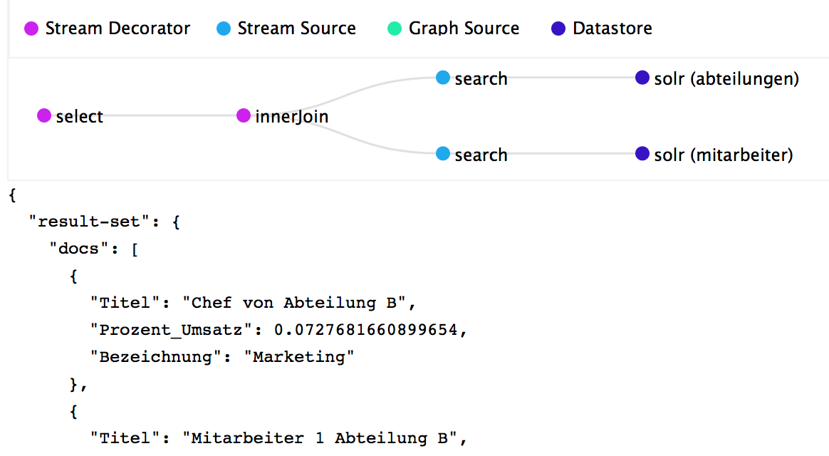 select(innerJoin(search(abteilungen,q=*:*,fl=“id,beschreibung_s,jahresumsatz_f“,sort=“id desc“), search(mitarbeiter,q=*:*, fl=“id,abteilung_s,title_s,gehalt_f“, sort=“abteilung_s desc“), on=“id=abteilung_s“),title_s as Titel,beschreibung_s as Bezeichnung,div(gehalt_f,jahresumsatz_f) as Prozent_Umsatz)
