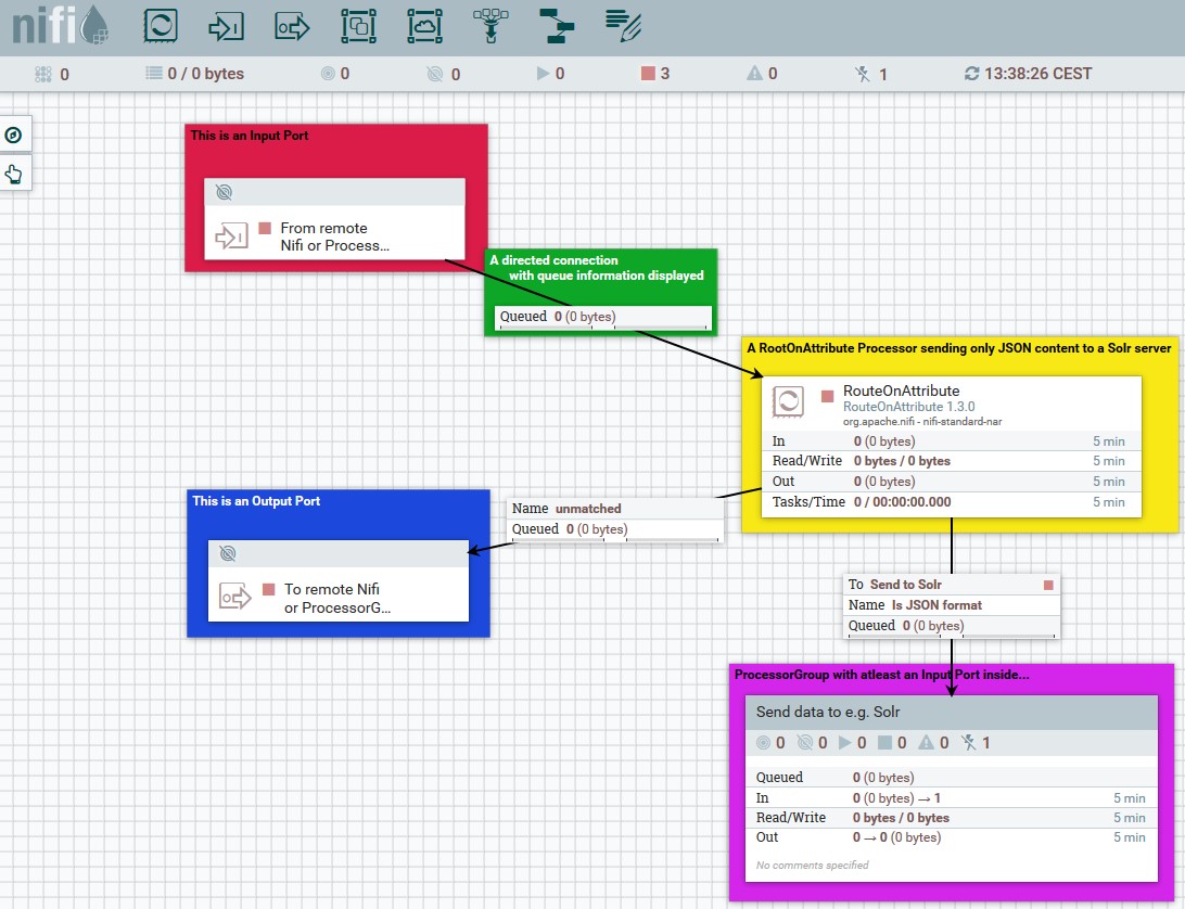 To illustrate the above concept, figure 1 shows all basic components inside NiFi’s web based user interface (version 1.3.0).