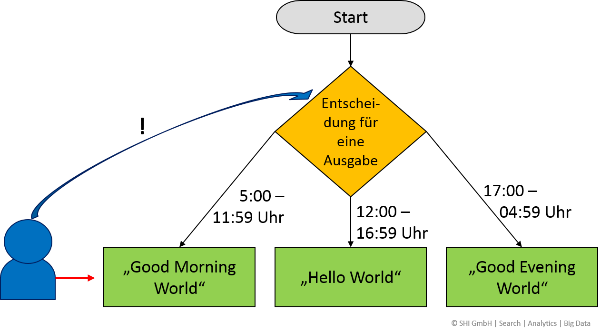 In der zweiten Ausbaustufe sorgen wir in unserem „Hello World“-Programm für etwas mehr Komplexität, indem wir nicht nur eine, sondern drei verschiedene Ausgaben zulassen: „Good Morning World“, „Good Evening World“ und weiterhin „Hello World“. Wir geben dem Programm feste Regeln für die Wahl der Ausgabe vor. So soll es vormittags den Besucher mit „Good Morning World“ begrüßen, abends ein „Good Evening World“ ausgeben und zu allen anderen Zeiten weiterhin auf das bekannte „Hello World“ zurückgreifen.