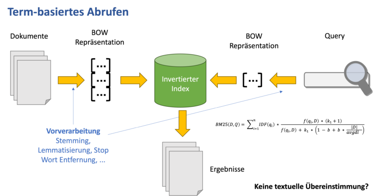 - Anhand der Übereinstimmung wird ein Relevanzwert berechnet, und die Dokumente mit den höchsten Werten werden ausgeliefert.