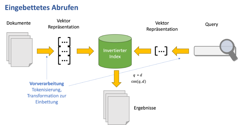 Bei der semantischen Suche wird die gesamte Menge an Dokumenten durchsucht. Hierbei werden die Dokumente getrennt von der Suchanfrage vom Transformer verarbeitet. Im Vorfeld wird für jedes Dokument ein Vektor berechnet, der seine verschiedenen Bedeutungen erfasst. Die Vektoren für die Dokumente müssen nur einmalig berechnet werden und können dann in einem Index abgespeichert werden. Das verhindert, dass bei jeder Suche sehr große Berechnungen ausgeführt werden müssen.