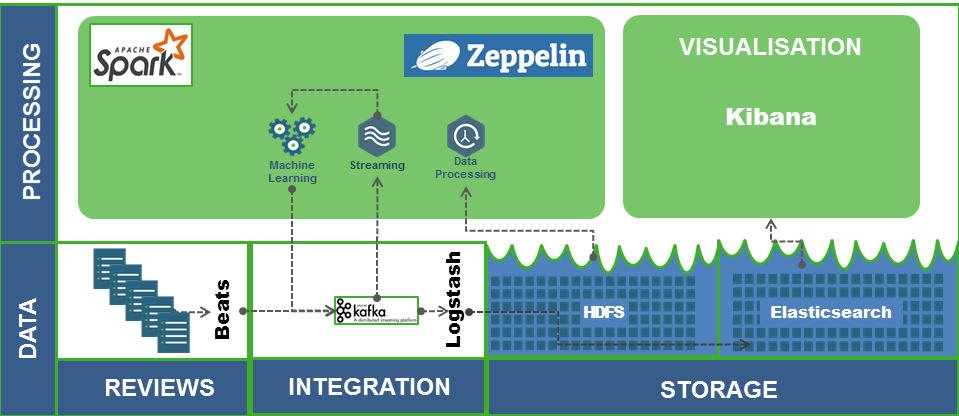Wie diese Anforderungen mit reinen Open Source Tools umgesetzt werden können, wurde bei den beiden Konferenzen anhand eines exemplarischen Use Cases gezeigt. Bei der Demo dieses Use Cases wurde ein kontinuierlicher Strom an Daten – Kundenrezensionen – simuliert, der über Beats* und Kafka von Spark eingelesen wurde, um die Bewertungen anhand des verfassten Textes in positive oder negative Bewertungen zu klassifizieren. Das Ergebnis wird zusammen mit der Rezension wieder in ein Kafka-Topic geschrieben, von wo aus Logstash* die analysierten Daten abholt und in einen Elasticsearch*-Index schreibt, der über Kibana* visualisiert werden kann.